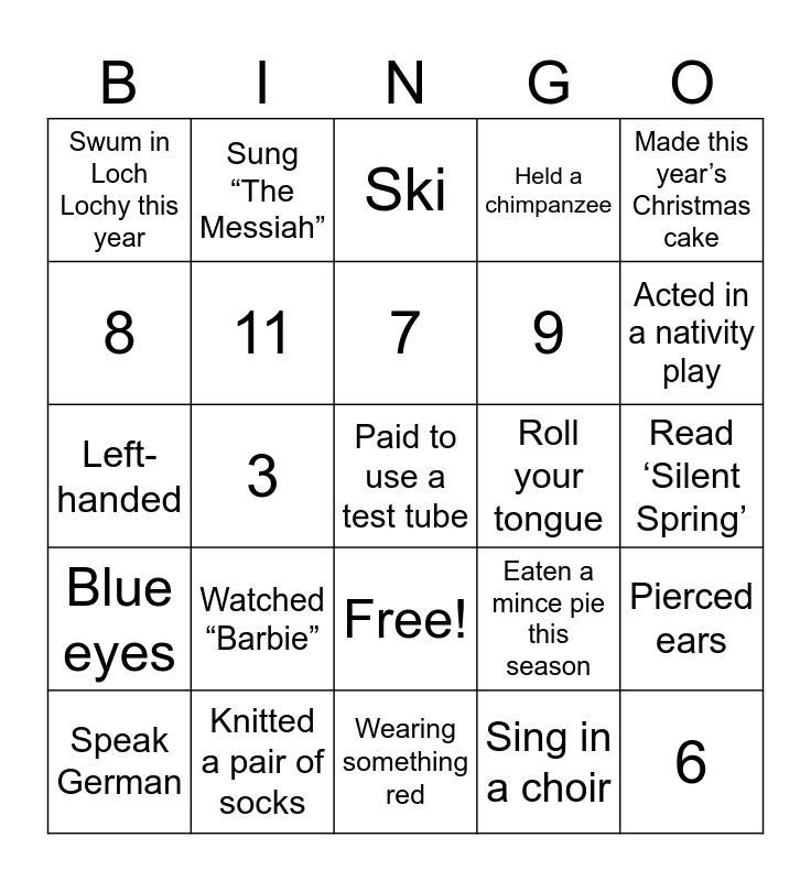 This bingo card has 45 words: Visited Greece, Paid to use a test tube, Speak French, Speak German, Enjoy Japanese food, Sing in a choir, Ski, Climbed Ben Nevis, Made this year’s Christmas cake, Knitted a pair of socks, Held a chimpanzee, Roll your tongue, Free!, Watched “Barbie”, Watched “Oppenheimer”, Wearing something red, Wearing something green, Left-handed, Right-handed, Acted in a nativity play, Sung “The Messiah”, Name the rugby World Cup winners 2023, Read ‘Lessons in Chemistry’, Swum in Loch Lochy this year, Know the FULL name of Lisa’s baby, Read ‘Silent Spring’, Read ‘Miss Vicker’s Angel’, Read ‘Winter Grave’, Eaten a mince pie this season, Blue eyes, Brown eyes, Pierced ears, Won a raffle, Have a middle name, 2, 3, 4, 5, 6, 7, 8, 9, 10, 11 and 12.