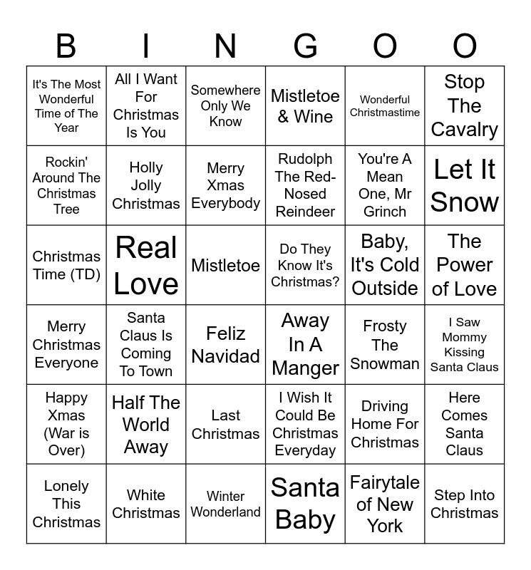 This bingo card has 37 words: Driving Home For Christmas, I Wish It Could Be Christmas Everyday, Fairytale of New York, Rockin' Around The Christmas Tree, Santa Claus Is Coming To Town, Baby, It's Cold Outside, Holly Jolly Christmas, Santa Baby, Wonderful Christmastime, Lonely This Christmas, Let It Snow, Mistletoe & Wine, Christmas Time (TD), Mistletoe, Stop The Cavalry, Do They Know It's Christmas?, Half The World Away, Somewhere Only We Know, The Power of Love, Real Love, It's The Most Wonderful Time of The Year, Rudolph The Red-Nosed Reindeer, Feliz Navidad, Frosty The Snowman, White Christmas, I Saw Mommy Kissing Santa Claus, All I Want For Christmas Is You, Winter Wonderland, Here Comes Santa Claus, Last Christmas, Silent Night, Holy Night, Away In A Manger, You're A Mean One, Mr Grinch, Happy Xmas (War is Over), Merry Christmas Everyone, Merry Xmas Everybody and Step Into Christmas.