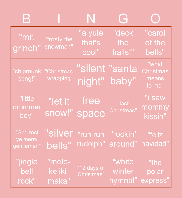 This bingo card has a free space and 24 words: "silver bells", "mele-keliki-maka", "silent night", "jingle bell rock", "carol of the bells", "mr. grinch", "chipmunk song!", "frosty the snowman", "last Christmas", "run run rudolph", "santa baby", "little drummer boy", "rockin' around", "feliz navidad", "Christmas wrapping, "white winter hymnal", "i saw mommy kissin", "a yule that's cool", "what Christmas means to me", "let it snow!", "the polar express", "God rest ye merry gentlemen", "deck the halls!" and "12 days of Christmas".