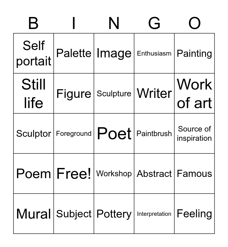This bingo card has a free space and 25 words: Free!, Pottery, Sculpture, Mural, Painting, Self portait, Still life, Palette, Paintbrush, Workshop, Writer, Sculptor, Abstract, Famous, Figure, Background, Source of inspiration, Image, Work of art, Foreground, Feeling, Subject, Poem, Enthusiasm and Interpretation.