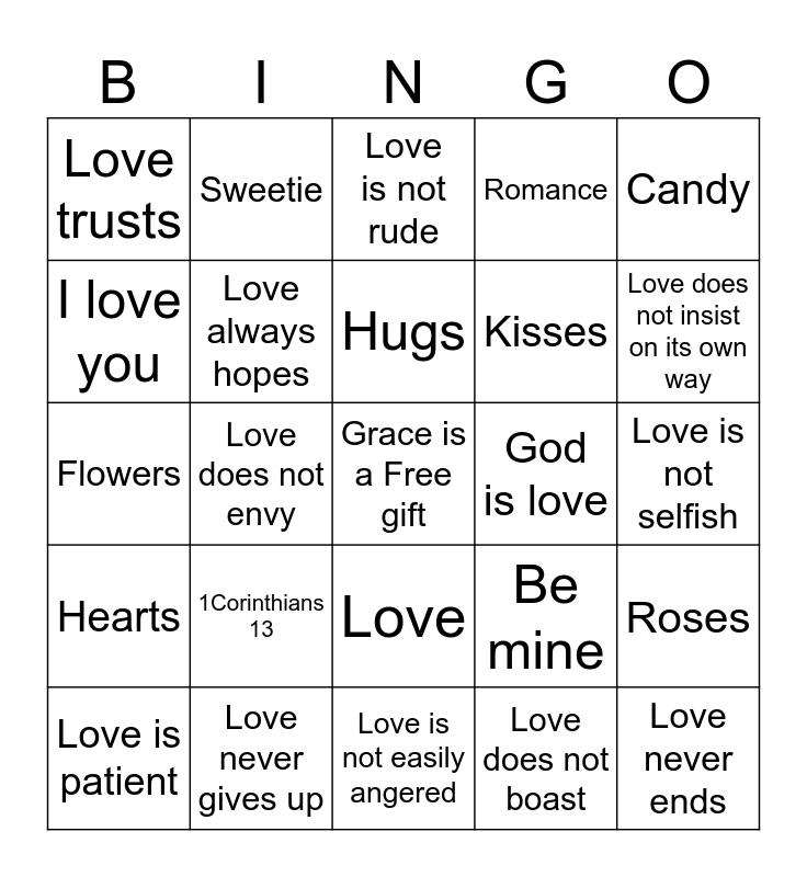 This bingo card has a free space and 29 words: Love is patient, Love is kind, Love does not envy, Love is not proud, Love trusts, Love is not rude, Love always hopes, 1Corinthians 13, God is love, Love never gives up, Love is not selfish, Love never ends, Love is not easily angered, Love does not boast, Love does not insist on its own way, Love rejoices with the truth, Love, Hearts, Candy, Flowers, Be mine, Love birds, Kisses, I love you, Romance, Sweetie, Roses, Hugs and Chocolate.