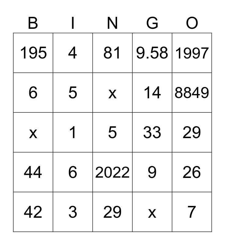 This bingo card has 25 words: 6, 29, x, 42, 1997, 195, 6, 4, 33, 2022, 14, x, 9, 26, 5, 7, 29, 81, 8849, 1, 5, 3, 44, 9.58 and x.