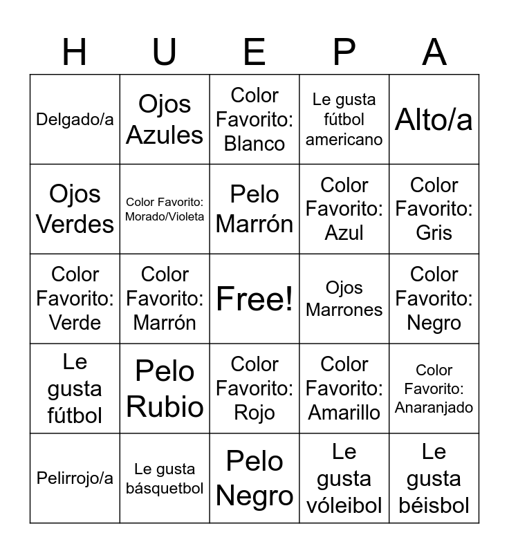 This bingo card has a free space and 25 words: Pelo Rubio, Pelo Negro, Pelo Marrón, Pelirrojo/a, Alto/a, Delgado/a, Ojos Verdes, Ojos Azules, Ojos Marrones, Color Favorito: Rojo, Color Favorito: Azul, Color Favorito: Verde, Color Favorito: Amarillo, Color Favorito: Anaranjado, Color Favorito: Morado/Violeta, Color Favorito: Rosado, Color Favorito: Negro, Color Favorito: Blanco, Color Favorito: Gris, Color Favorito: Marrón, Le gusta béisbol, Le gusta básquetbol, Le gusta fútbol, Le gusta fútbol americano and Le gusta vóleibol.