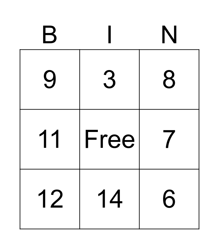 This bingo card has a free space and 16 words: 1, 2, 8, 9, 4, 3, 5, 10, 6, 7, 13, 11, Free, 14, 12 and 4.