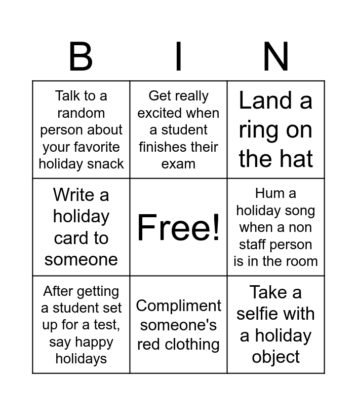 This bingo card has a free space and 25 words: Get someone to finish the lyric, Find out someone's holiday plans, Compliment someone's red clothing, Tell someone a joke, Take a selfie with a holiday object, Talk to a random person about your favorite holiday snack, Hum a holiday song when a non staff person is in the room, Get really excited when a student finishes their exam, Find an office with a holiday decoration up, Take a group picture, Shake your head yes while setting a student up for a test, find out a gift someone bought for someone this year, Find out what someone wants for Christmas, make an ornament, After getting a student set up for a test, say happy holidays, Offer a student a piece of chocolate, See if someone can guess the movie your describing., Land a ring on the hat, make up a holiday dance, play your favorite holiday song for all to hear, Greet someone with at least 3 holiday sayings, Complete a countdown activity page, Drink a sip of eggnog, Write a holiday card to someone and Print out a picture of yourself and put it on the lockers..