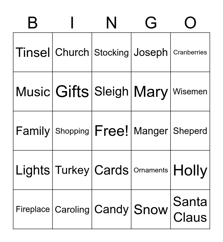 This bingo card has a free space and 36 words: Angel, Donkey, Tree, Gifts, Ornaments, Lights, Sleigh, Rudolph, Cranberries, Parties, Shopping, Joseph, Sheep, Manger, Wisemen, Tinsel, Jesus, Turkey, Santa Claus, Stocking, Sheperd, Holly, Caroling, Fireplace, Candy, Church, Family, Popcorn, Mary, Music, Star, Mistletoe, Snow, Cards, Reindeer and Love.