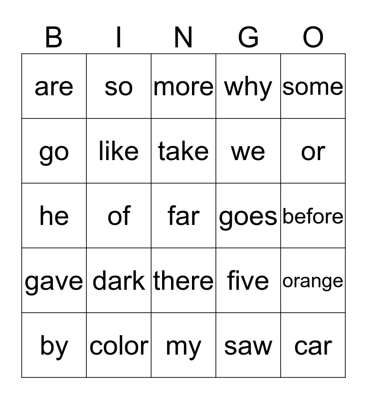 This bingo card has 36 words: name, home, here, like, five, gave, take, came, some, come, of, why, oh, goes, or, are, car, dark, far, more, before, orange, color, by, my, so, he, be, we, go, what, truck, saw, there, give and have.