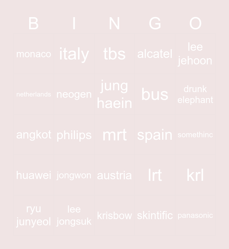 This bingo card has a free space and 24 words: jongwon, lee jongsuk, jung haein, ryu junyeol, lee jehoon, monaco, netherlands, italy, spain, austria, bus, angkot, lrt, krl, neogen, skintific, somethinc, tbs, drunk elephant, philips, panasonic, huawei, alcatel and krisbow.
