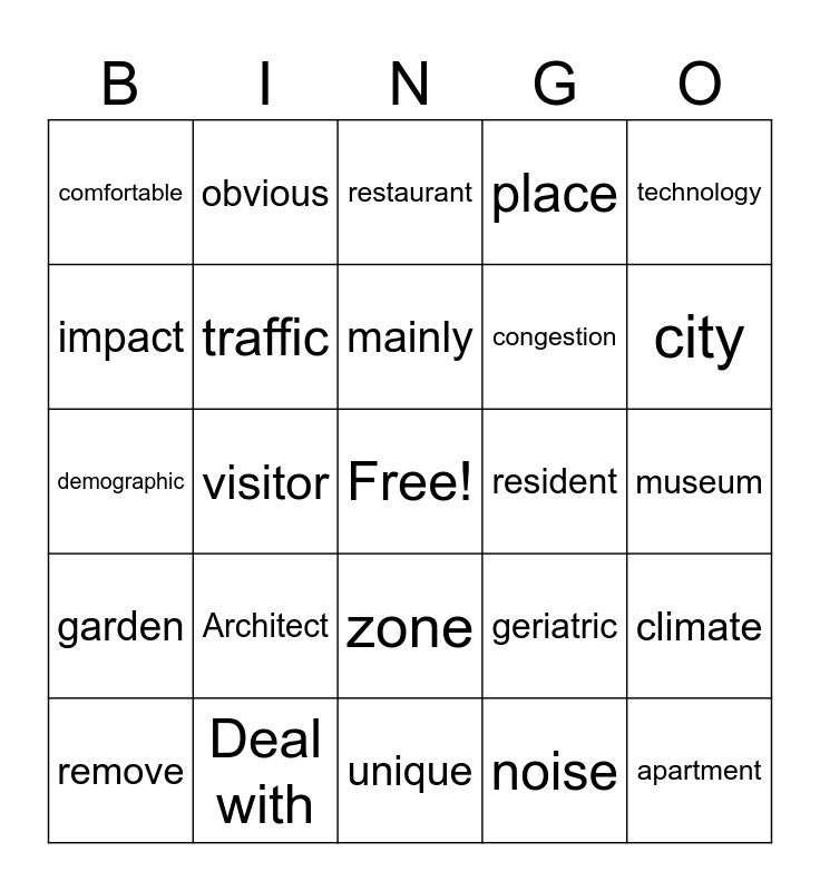 This bingo card has a free space and 24 words: Architect, Deal with, mainly, remove, technology, comfortable, impact, obvious, resident, zone, congestion, demographic, geriatric, climate, traffic, noise, museum, restaurant, city, visitor, apartment, garden, place and unique.