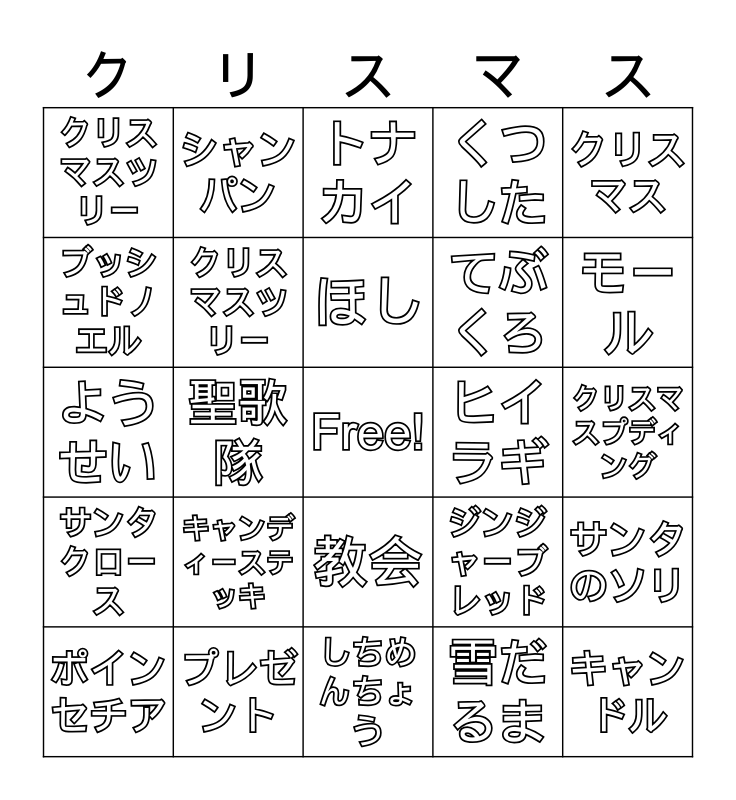 This bingo card has a free space and 24 words: キャンディーステッキ, プレゼント, ほし, ポインセチア, クリスマス, クリスマスツリー, ブッシュドノエル, シャンパン, ヒイラギ, 教会, てぶくろ, ようせい, ジンジャーブレッド, サンタのソリ, クリスマスツリー, 雪だるま, クリスマスプディング, トナカイ, モール, 聖歌隊, キャンドル, サンタクロース, くつした and しちめんちょう.