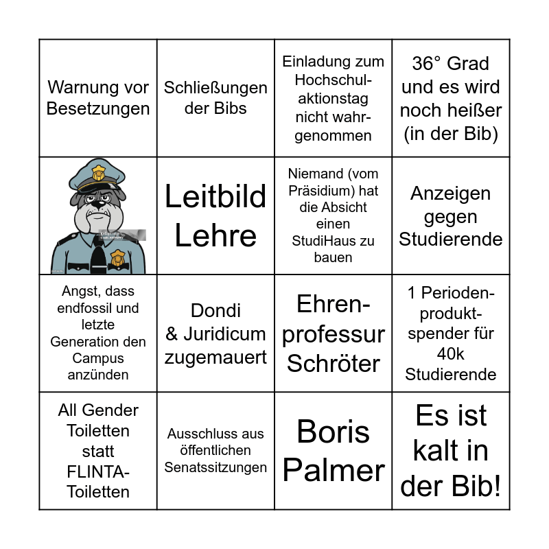 This bingo card has 1 images and 15 words: Ausschluss aus öffentlichen Senatssitzungen, 1 Perioden-produkt-spender für 40k Studierende, Einladung zum Hochschul-aktionstag nicht wahr-genommen, Warnung vor Besetzungen, Angst, dass endfossil und letzte Generation den Campus anzünden, Schließungen der Bibs, Ehren-professur Schröter, Boris Palmer, Leitbild Lehre, All Gender Toiletten statt FLINTA-Toiletten, 36° Grad und es wird noch heißer (in der Bib), Dondi & Juridicum zugemauert, Anzeigen gegen Studierende, Niemand (vom Präsidium) hat die Absicht einen StudiHaus zu bauen and Es ist kalt in der Bib!.