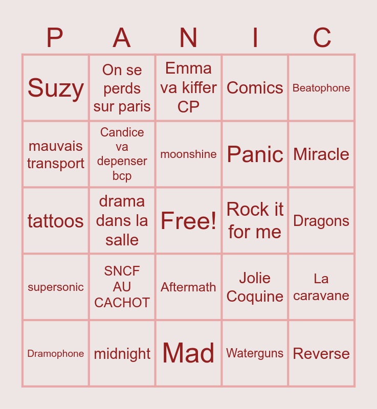 This bingo card has a free space and 34 words: Lone Digger, Waterguns, Plume, Brotherswing, supersonic, Candice va depenser bcp, Beatophone, Dramophone, On se perds sur paris, Mighty, moonshine, Emma va kiffer CP, Human Leather Shoes, On va trouver qq qu'on connait, Rock it for me, Miracle, midnight, tattoos, SNCF AU CACHOT, Jolie Coquine, Aftermath, on va se faire prendre en photo, Suzy, Dragons, Mad, Reverse, Comics, Wonderland, Panic, mauvais transport, qq va perdre qqch, drama dans la salle, La caravane and Clash.