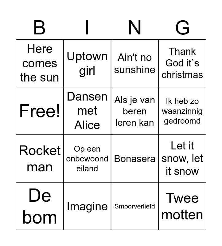 This bingo card has 16 words: Imagine, Let it snow, let it snow, Ain't no sunshine, Here comes the sun, Rocket man, Uptown girl, Bonasera, Smoorverliefd, Free!, Dansen met Alice, De bom, Thank God it`s christmas, Op een onbewoond eiland, Ik heb zo waanzinnig gedroomd, Als je van beren leren kan and Twee motten.