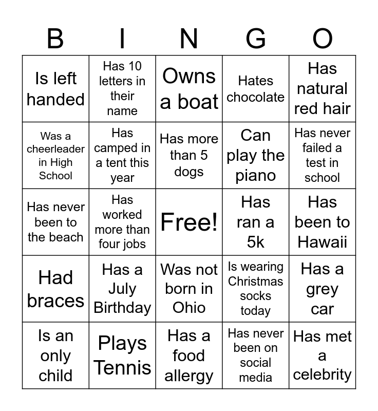 This bingo card has a free space and 24 words: Has a July Birthday, Plays Tennis, Has more than 5 dogs, Is an only child, Has natural red hair, Is left handed, Was a cheerleader in High School, Has 10 letters in their name, Has ran a 5k, Was not born in Ohio, Can play the piano, Has never been to the beach, Is wearing Christmas socks today, Has a grey car, Has camped in a tent this year, Has never been on social media, Has been to Hawaii, Owns a boat, Has never failed a test in school, Has worked more than four jobs, Has met a celebrity, Had braces, Hates chocolate and Has a food allergy.