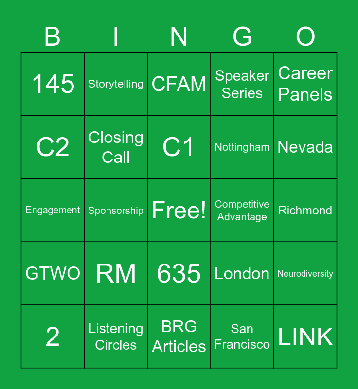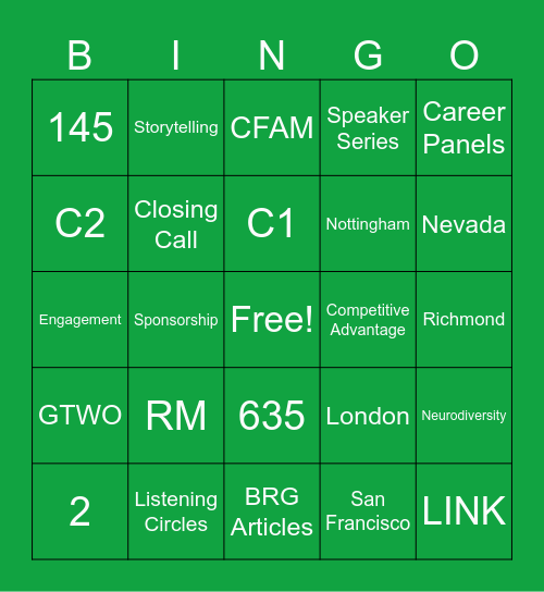 This bingo card has a free space and 75 words: AfroTech Conference, Career fair, CFAM, LINK, McLean, West Creek, Plano, New Orleans, Venture X, Savor, Quicksilver, 360, C1, C2, C3, Sponsorship, Recruiting, LINK, Interviewing, Career Panels, Hybrid, Engagement, Closing Call, Storytelling, Speaker Series, Resource Curation, Education, Boston, Canada, Chicago, Delaware, Florida, Houston, London, Nevada, Nottingham, NoVa, Dallas, Richmond, San Francisco, 8, 3, 118, 270, 1, 14, 2, 145, 11, 1, 38, 635, 252, 245, 800, 6, Risk Management, NLI, Team Building, DIB, RM, Networking, In Action, Volunteer, Ambassadors, Competitive Advantage, Capital One, Team Exercise, Fabulous Flower, Neurodiversity, GTWO, Listening Circles, Privilege for Sale, BRG Articles and BRG Partnership.