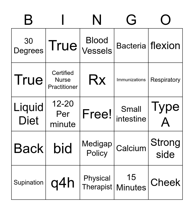 This bingo card has a free space and 24 words: bid, q4h, Rx, Supination, flexion, 30 Degrees, True, True, Small intestine, Medigap Policy, Immunizations, Liquid Diet, Calcium, Strong side, Certified Nurse Practitioner, 15 Minutes, Type A, Blood Vessels, Respiratory, 12-20 Per minute, Cheek, Back, Bacteria and Physical Therapist.