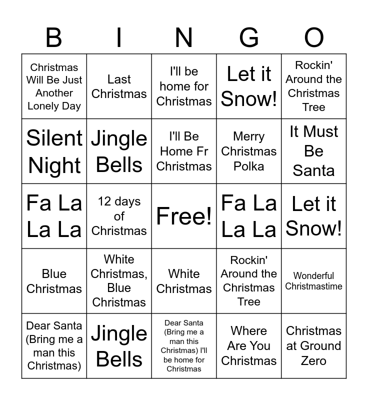 ⚠ This card has duplicate items: Christmas at Ground Zero (2), It Must Be Santa (2), All I want for Christmas is you (2), Last Christmas (2), Winter Wonderland (2), Silent Night (2), O Holy Night (2), Jingle Bells (2), Let it Snow! (2), Wonderful Christmastime (2), Rockin' Around the Christmas Tree (3), Dominick the Donkey (2), Grandma Got Run Over By A Reindeer (2), Fa La La La (2), Holiday Party (2), 12 days of Christmas (2), I'll be home for Christmas (2)