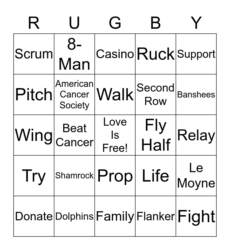 This bingo card has a free space and 24 words: Shamrock, Dolphins, Walk, Donate, Support, Scrum, Pitch, 8-Man, Fly Half, Prop, Second Row, Wing, Life, Le Moyne, American Cancer Society, Flanker, Relay, Casino, Banshees, Beat Cancer, Fight, Try, Ruck and Family.