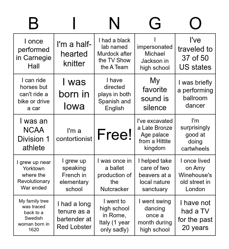 This bingo card has a free space and 33 words: As a child, I smuggled a baby rabbit into church services, I have been inside the NYPD's 5th Precinct more than once, I'm a contortionist, I've interviewed Method Man, I grew up near Yorktown where the Revolutionary War ended, I was born in Iowa, I've traveled to 37 of 50 US states, My family tree was traced back to a Swedish woman born in 1620, I'm a half-hearted knitter, I studied classical piano starting at age 8, I have directed plays in both Spanish and English, I had a black lab named Murdock after the TV Show the A Team, I read 150 books last year, I'm studying Swedish, I've excavated a Late Bronze Age palace from a Hittite kingdom, I was briefly a performing ballroom dancer, I had a long tenure as a bartender at Red Lobster, I was an NCAA Division 1 athlete, I grew up speaking French in elementary school, I helped take care of two beavers at a local nature sanctuary, I was once in a ballet production of the Nutcracker, I share a birthday with my grandma, I once performed in Carnegie Hall, I'm surprisingly good at doing cartwheels, I went to high school in Rome, Italy (1 year only sadly), I have not had a TV for the past 20 years, I impersonated Michael Jackson in high school, My favorite sound is silence, I can ride horses but can't ride a bike or drive a car, I once lived on Amy Winehouse's old street in London, I played Louisa in a town performance of the Sound of Music, I went swing dancing once a month during high school and I named my cats after classical literary authors.