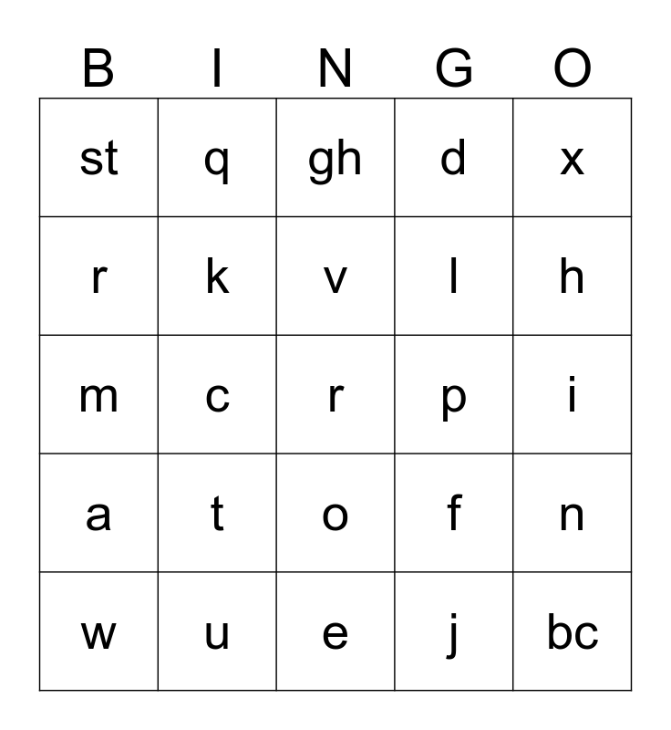 This bingo card has a free space and 24 words: t, u, v, w, x, st, r, q, p, o, l, m, f, n, k, j, i, gh, h, c, bc, a, d and e.