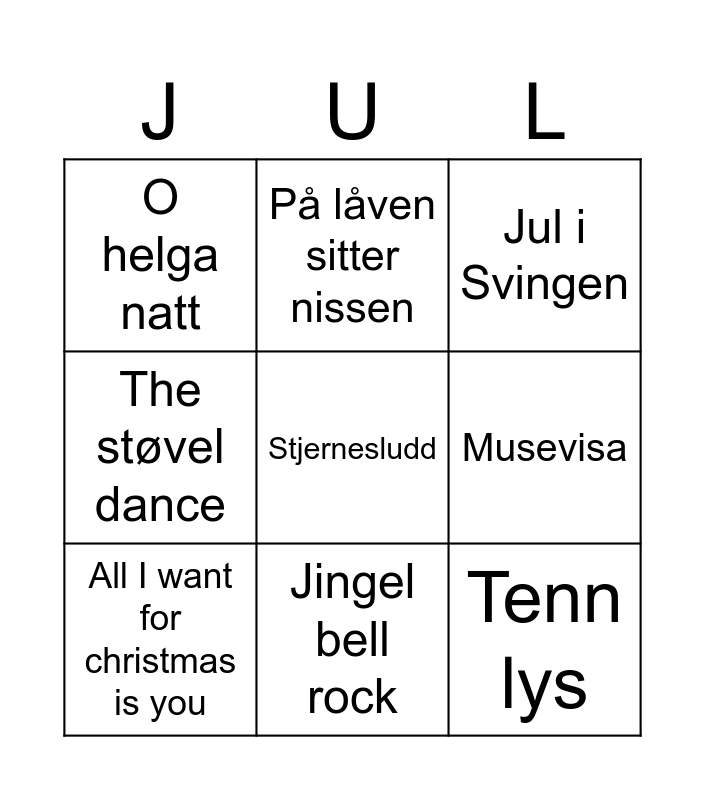This bingo card has 20 words: Driving home for christmas, Let it snow let it snow, Jul i Svingen, Vi tenner våre lykter, Hei hå nå er det jul igjen, Stjernesludd, Hey ho!, O helga natt, Tenn lys, På låven sitter nissen, Glade jul, Bjelleklang, Musevisa, Nå tennes tusen julelys, All I want for christmas is you, Julekveldsvisa, Jingel bell rock, The støvel dance, Last christmas and Home for christmas.