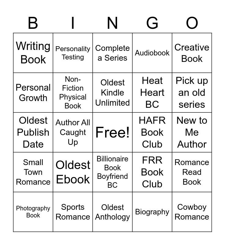 This bingo card has a free space and 25 words: Oldest Ebook, Oldest Anthology, Oldest Kindle Unlimited, Photography Book, Creative Book, Writing Book, Personal Growth, Personality Testing, HAFR Book Club, Billionaire Book Boyfriend BC, Heat Heart BC, Oldest Publish Date, FRR Book Club, Romance Read Book, Non-Fiction Physical Book, Fiction Physical Book, New to Me Author, Complete a Series, Pick up an old series, Author All Caught Up, Cowboy Romance, Sports Romance, Small Town Romance, Audiobook and Biography.