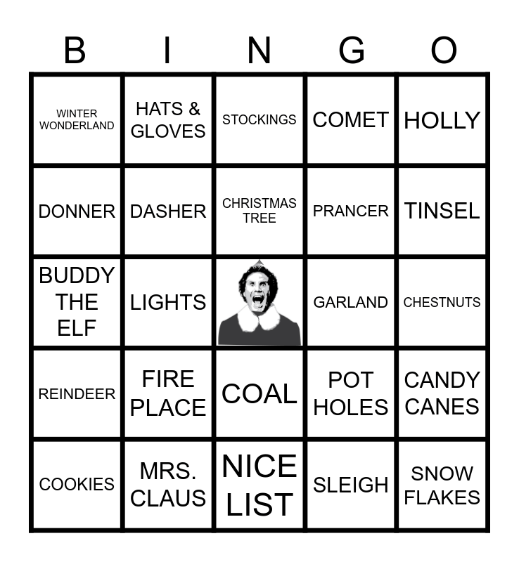 This bingo card has a free space and 59 words: SANTA, MRS. CLAUS, ELVES, REINDEER, SLEIGH, RUDDOLPH, DASHER, DANCER, PRANCER, VIXEN, COMET, CUPID, DONNER, BLITZEN, SNOWBALL, WINTER WONDERLAND, SNOW FLAKES, HOLLY, MISTELTOE, CHRISTMAS TREE, GARLAND, STOCKINGS, COOKIES, CANDY CANES, SLEDDING, POINSETTIA, STAR, ORNAMENTS, TINSEL, FROSTY THE SNOWMAN, GRINCH, FAMILY, FRIENDS, CAROLING, HATS & GLOVES, COATS & SCARVES, BOOTS, LIGHTS, SILVER BELLS, BUDDY THE ELF, PRESENTS, FIRE PLACE, CHESTNUTS, JACK FROST, SNOW ANGELS, ICE SKATING, NORTH POLE, SUGAR PLUMS, COAL, NICE LIST, NAUGHTY LIST, CHIMNEY, COLD, SLUSH, SNOW DAYS, POT HOLES, BLIZZARD, WRAPPING PAPER and RIBBONS & BOWS.