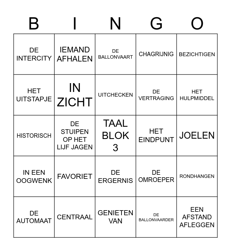 This bingo card has a free space and 45 words: AFSCHEID NEMEN, EEN AFSTAND AFLEGGEN, AFWIJKEND, DE AUTOMAAT, AVONTUURLIJK, DE BALLONVAARDER, DE BALLONVAART, DE BESTEMMING, BEZICHTIGEN, CENTRAAL, CHAGRIJNIG, HET EINDPUNT, DE ERGERNIS, FAVORIET, DE GASBRANDER, GENIETEN VAN, GINDS, HISTORISCH, HET HOOGSEIZOEN, HET HULPMIDDEL, IEMAND AFHALEN, INCHECKEN, INTENS, DE INTERCITY, INTERNATIONAAL, JOELEN, DE LUCHTBALLON, MANSHOOG, DE OMROEPER, IN EEN OOGWENK, OP PAD GAAN, RONDHANGEN, DE SNELTREIN, STIPT OP TIJD, DE STOPTREIN, DE STUIPEN OP HET LIJF JAGEN, TERUGKEREN NAAR, HET TRAJECT, IN TREK ZIJN, UITCHECKEN, HET UITSTAPJE, DE VERTRAGING, DE WINDRICHTING, IN ZICHT and HET ZIET ZWART VAN DE MENSEN.
