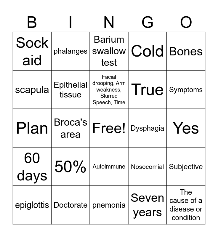This bingo card has a free space and 24 words: 50%, Doctorate, Facial drooping, Arm weakness, Slurred Speech, Time, epiglottis, Bones, Sock aid, scapula, phalanges, Dysphagia, Autoimmune, True, Plan, Nosocomial, Subjective, Epithelial tissue, Seven years, Yes, Barium swallow test, Symptoms, Broca's area, The cause of a disease or condition, 60 days, Cold and pnemonia.