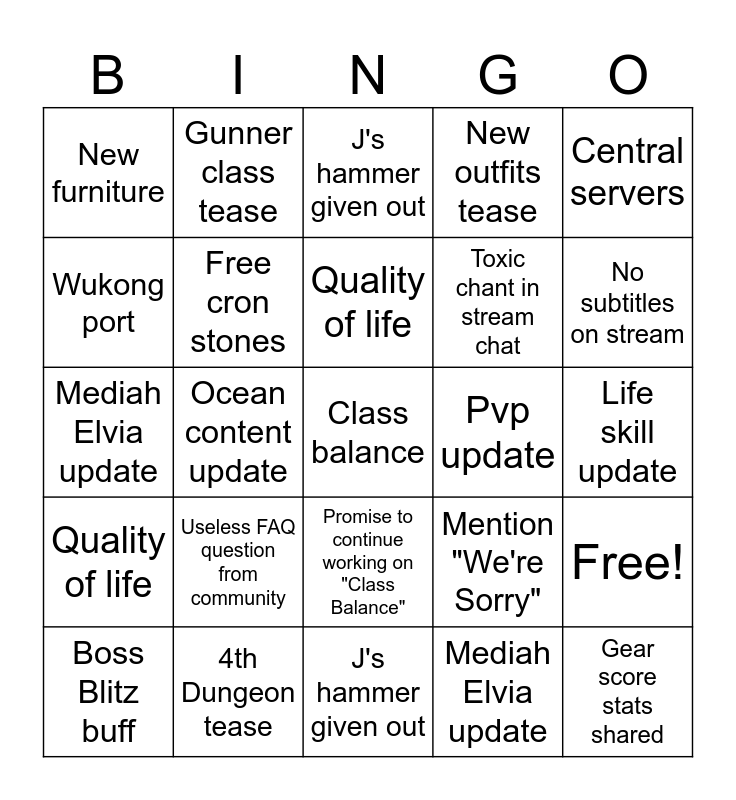 ⚠ This card has duplicate items: No subtitles on stream (2), Class balance (2), Boss Blitz buff (2), J's hammer given out (2), Useless FAQ question from community (2), Update on Caphras (2), Gunner class tease (2), Random Shai-specific feature (2), Wukong port (2), 4th Dungeon tease (2), Free cron stones (2), New outfits tease (2), Mention "We're Sorry" (2), Land of morning light part 2 (2), Life skill update (2), Quality of life (2), Pvp update (2), War of the Roses (2), Central servers (2), Ocean content update (2), Mediah Elvia update (2), New furniture (2), Toxic chant in stream chat (2), Promise to continue working on "Class Balance" (2), Gear score stats shared (2)