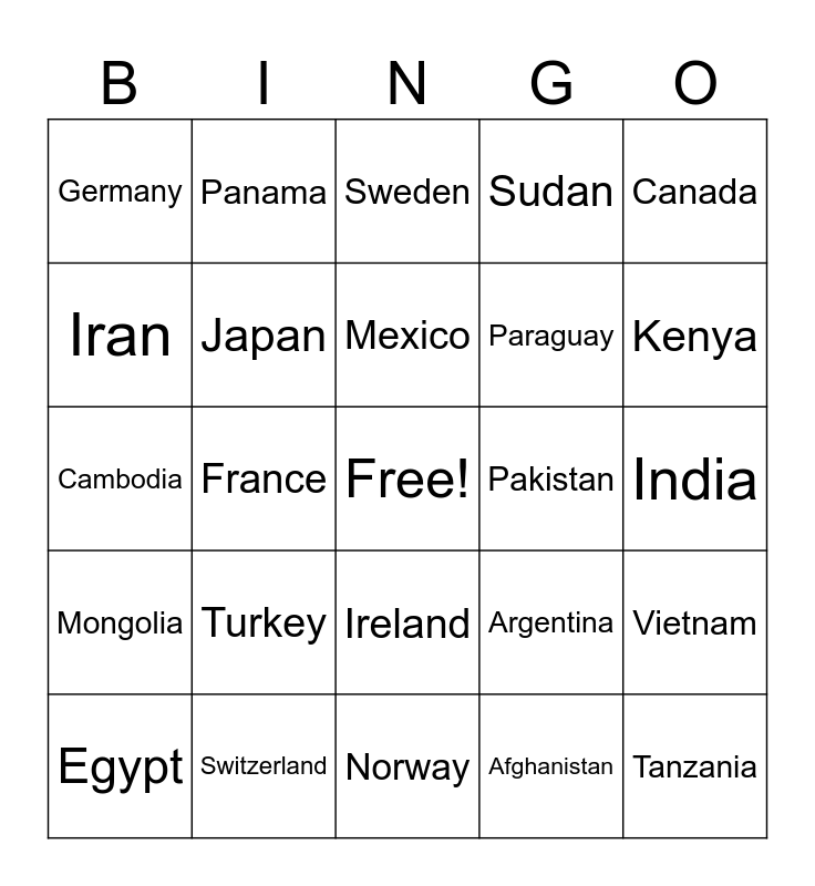 This bingo card has a free space and 39 words: US, South Africa, Italy, Japan, Egypt, Ireland, Mexico, Kazakhstan, Canada, Mongolia, France, Sudan, Tanzania, India, Pakistan, Turkey, Brazil, Germany, Haiti, Argentina, Iran, Norway, Paraguay, Kenya, Israel, Ukraine, Russia, Dominican Republic, Jamaica, Panama, Columbia, Peru, Sweden, Switzerland, Afghanistan, Saudi Arabia, Vietnam, Cambodia and South Korea.