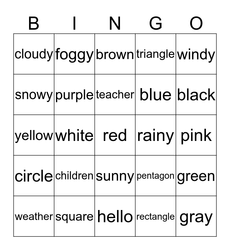 This bingo card has 25 words: children, hello, teacher, weather, windy, cloudy, snowy, foggy, rainy, sunny, blue, yellow, pentagon, green, purple, gray, pink, brown, black, white, red, square, circle, triangle and rectangle.