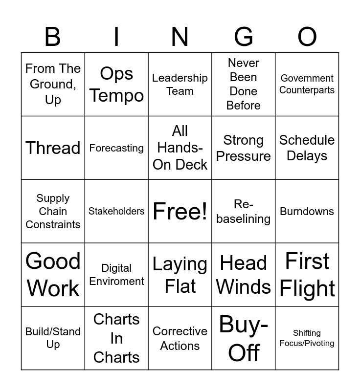This bingo card has a free space and 36 words: Agile, Requirements, High Level, Forecasting, Head Winds, Good Work, All Hands-On Deck, Tech. Debt, Government Counterparts, Customer, Stakeholders, Never Been Done Before, The Warfighter, Re-baselining, Schedule Delays, From The Ground, Up, Systems Engineering, Digital Enviroment, Shifting Focus/Pivoting, Leadership Team, Burndowns, First Flight, Charts In Charts, Build/Stand Up, Corrective Actions, Ops Tempo, Supply Chain Constraints, Bring Online, Strong Pressure, Thread, Calculated Ambiguity, Continual Integration, Buy-Off, Laying Flat, Spearhead that effort and Flowdown.