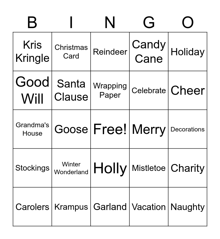 This bingo card has a free space and 69 words: Gingerbread House, Decorations, Angel, Yule Log, Krampus, Silver, Candy Cane, Feast, Holiday, Jolly, Charity, Wreath, Kris Kringle, Reindeer, Eggnog, Goose, Holly, Celebrate, Christmas, Stockings, Merry, Mistletoe, Cheer, Elves, Grinch, Ice Skating, Nutcracker, Toys, Vacation, Bells, Christmas Card, Gingerbread, Joy to the World, Cookies, Visit, Lights, Sleigh, Figgy Pudding, Good Will, Jingle Bells, Winter Wonderland, Naughty, Snowball, North Pole, Nice, Carolers, Fruitcake, Gold, Chestnuts, Santa Clause, Wrapping Paper, Snow, Coal, Garland, Jack Frost, Partridge, Sled, Christmas Tree, Frosty the Snowman, Grandma's House, Cranberries, Family, Festive, Generosity, Gingerbread Men, Presents, Scrooge, Snowman and Tinsel.