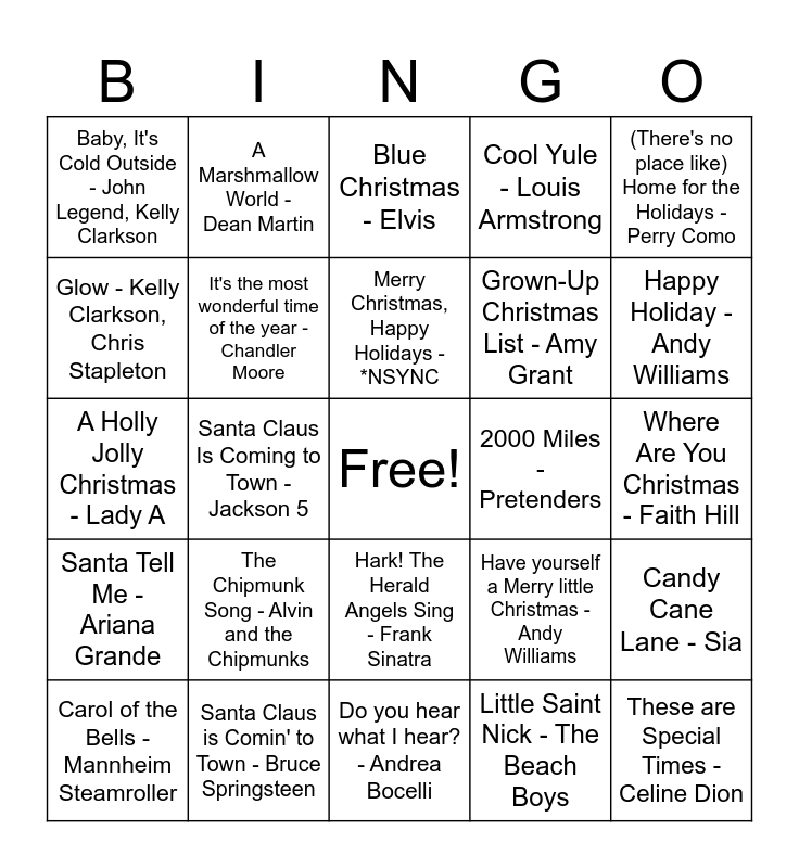 This bingo card has a free space and 37 words: Put a little holiday in your heart - Cher, Cyndi Lauper, Give Love This Year - Fitz and the Tantrums, Happy Xmas (War is Over) - John Lennon, It's the most wonderful time of the year - Chandler Moore, Candy Cane Lane - Sia, The Chipmunk Song - Alvin and the Chipmunks, Merry Christmas, Happy Holidays - *NSYNC, Wonderful Christmastime - Paul McCartney, (There's no place like) Home for the Holidays - Perry Como, You're a Mean One, Mr. Grinch - Thurl Ravenscroft, Santa Claus Is Coming to Town - Jackson 5, Cool Yule - Louis Armstrong, These are Special Times - Celine Dion, Where Are You Christmas - Faith Hill, Glow - Kelly Clarkson, Chris Stapleton, Santa Tell Me - Ariana Grande, A Holly Jolly Christmas - Burl Ives, Blue Christmas - Elvis, Hark! The Herald Angels Sing - Frank Sinatra, 2000 Miles - Pretenders, Baby, It's Cold Outside - John Legend, Kelly Clarkson, Happy Holiday - Andy Williams, Carol of the Bells - Mannheim Steamroller, Do you hear what I hear? - Andrea Bocelli, All Alone on Christmas - Darlene Love, Little Saint Nick - The Beach Boys, A Marshmallow World - Dean Martin, Christmas Tree Farm - Taylor Swift, Rockin' Around the Christmas Tree - Brenda Lee, The Christmas Song - Michael Buble, We Wish You the Merriest - Seth McFarlane and Liz Gilles, Santa Claus is Comin' to Town - Bruce Springsteen, A Holly Jolly Christmas - Lady A, Jingle Bells - Gween Stefani, Have yourself a Merry little Christmas - Andy Williams, Grown-Up Christmas List - Amy Grant and All I want for Christmas is You - Mariah Carey.