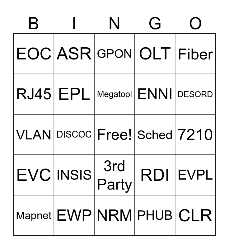 This bingo card has a free space and 24 words: INSIS, EWP, Megatool, Mapnet, Fiber, EOC, RJ45, ASR, Sched, 3rd Party, ENNI, VLAN, RDI, EVPL, EPL, PHUB, 7210, GPON, DESORD, DISCOC, CLR, EVC, OLT and NRM.