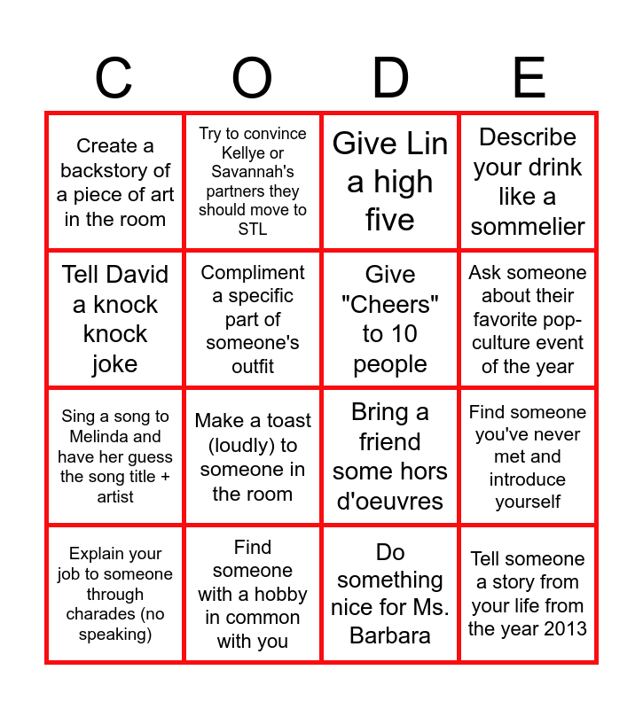 This bingo card has 20 words: Find someone you've never met and introduce yourself, Ask someone for a drink rec and try it out!, Give Lin a high five, Take a picture with a co-worker and text it to Lisa, Explain your job to someone through charades (no speaking), Tell David a knock knock joke, Find someone with a hobby in common with you, Create a backstory of a piece of art in the room, Sing a song to Melinda and have her guess the song title + artist, Try to convince Kellye or Savannah's partners they should move to STL, Make a toast (loudly) to someone in the room, Bring a friend some hors d'oeuvres, Compliment a specific part of someone's outfit, Tell someone a story from your life from the year 2013, Give "Cheers" to 10 people, Write your full name with your non-dominant hand (back of paper), Ask someone about their favorite pop-culture event of the year, Describe your drink like a sommelier, Do something nice for Ms. Barbara and Ask Julian a creepy background question about his life (maybe about his twin?).