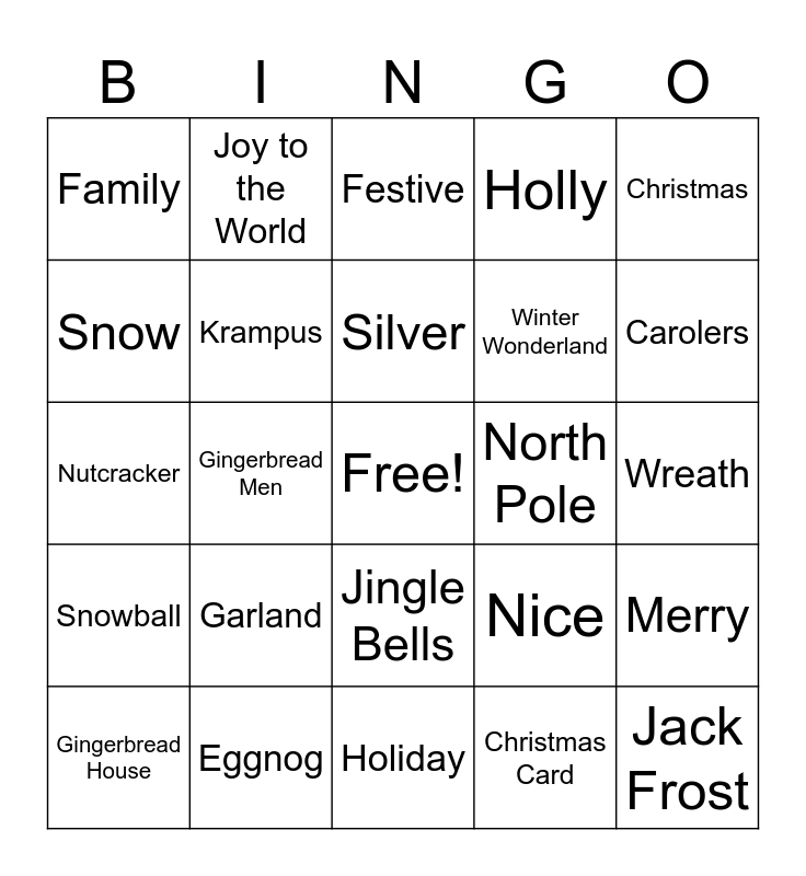 This bingo card has a free space and 69 words: Charity, Wreath, Kris Kringle, Reindeer, Eggnog, Goose, Holly, Celebrate, Christmas, Stockings, Merry, Mistletoe, Family, Festive, Generosity, Gingerbread Men, Jingle Bells, Winter Wonderland, Naughty, Snowball, North Pole, Nice, Carolers, Fruitcake, Gold, Chestnuts, Santa Clause, Bells, Christmas Card, Gingerbread, Joy to the World, Cookies, Visit, Lights, Sleigh, Figgy Pudding, Good Will, Wrapping Paper, Snow, Coal, Garland, Jack Frost, Partridge, Sled, Christmas Tree, Gingerbread House, Decorations, Angel, Yule Log, Krampus, Silver, Candy Cane, Feast, Holiday, Jolly, Cheer, Elves, Grinch, Ice Skating, Nutcracker, Toys, Vacation, Presents, Scrooge, Snowman, Tinsel, Frosty the Snowman, Grandma's House and Cranberries.