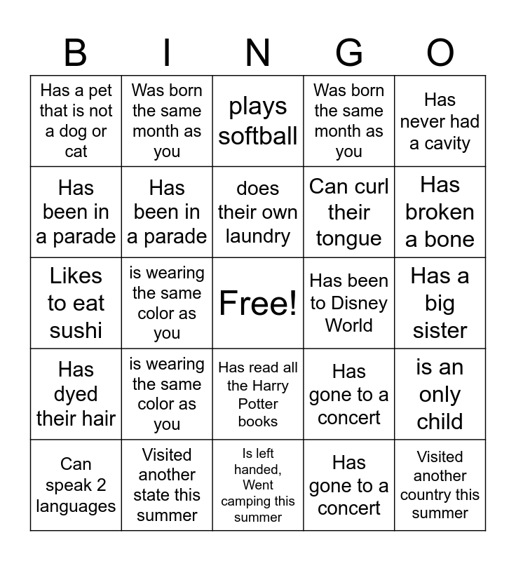 ⚠ This card has duplicate items: Has broken a bone (2), Can speak 2 languages (2), Has a little brother (2), Has a pet that is not a dog or cat (2), Has a big sister (3), Has been in a parade (2), Likes to eat sushi (2), Can curl their tongue (2), Has dyed their hair (2), Was born the same month as you (2), Has read all the Harry Potter books (2), Plays a musical instrument (2), Has braces (2), Has been in a play or musical (2), Has never had a cavity (2), is wearing the same color as you (2), Visited another state this summer (2), Visited another country this summer (2), Has been to Disney World (2), Has eaten an bug (2), Has gone to a concert (2), plays softball (2), can do a cartwheel (2), does their own laundry (2), is an only child (2), likes pickles (2)