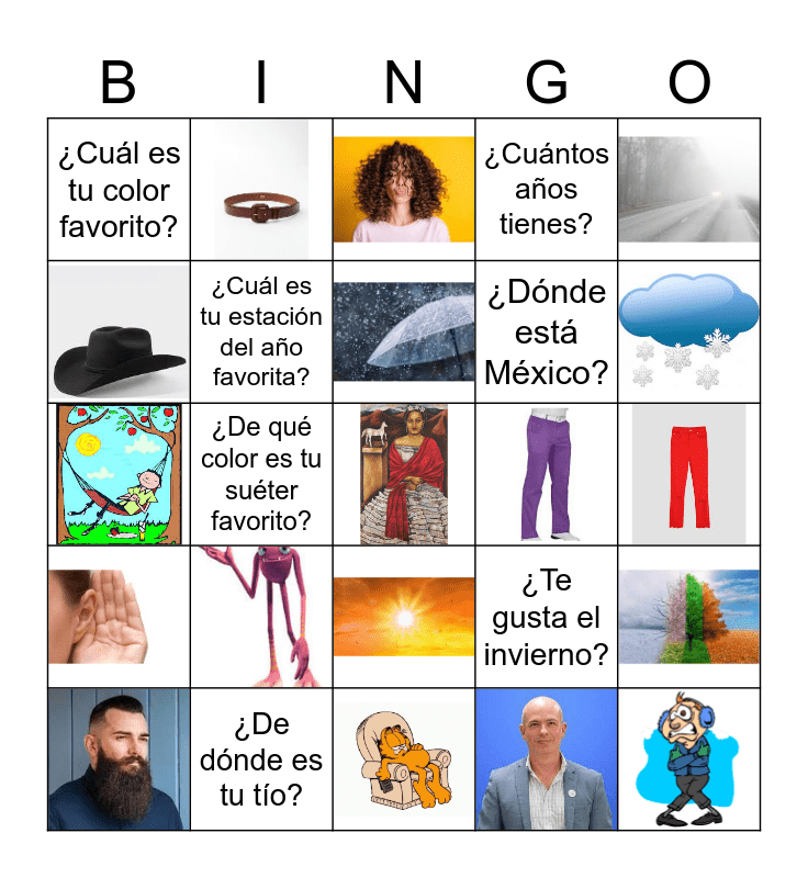 This bingo card has 25 images and 10 words: ¿Cómo es tu madre?, ¿Cuál es tu estación del año favorita?, ¿Cuántos años tienes?, ¿Cómo te llamas?, ¿Cuál es tu color favorito?, ¿De qué color es tu suéter favorito?, ¿Te gusta el invierno?, ¿De dónde es tu tío?, ¿Dónde vive tu hermano? and ¿Dónde está México?.