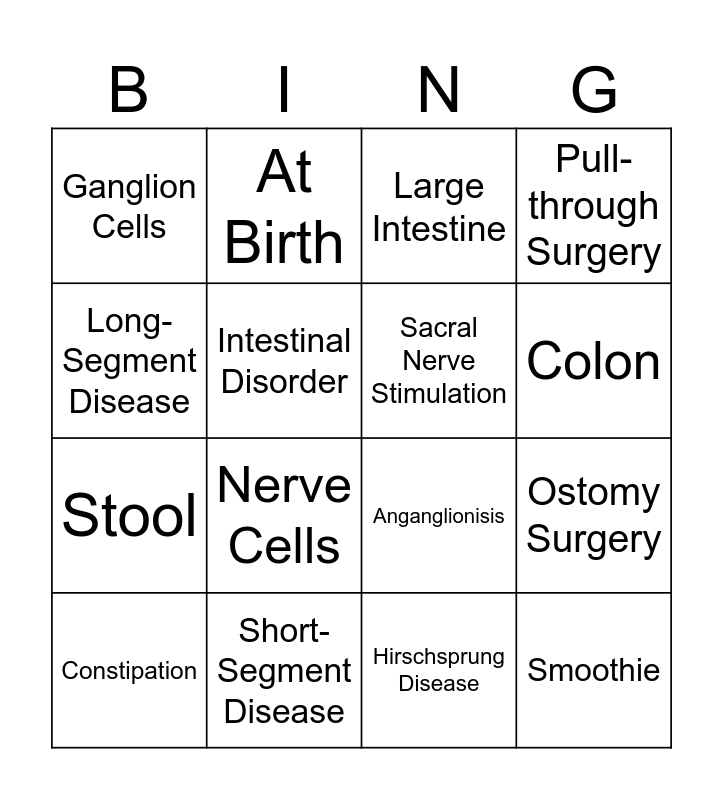 This bingo card has 17 words: Hirschsprung Disease, Constipation, Large Intestine, Ganglion Cells, Nerve Cells, Pull-through Surgery, Ostomy Surgery, Sacral Nerve Stimulation, Colon, Intestinal Disorder, Short-Segment Disease, Anganglionisis, Long-Segment Disease, At Birth, Stool, Quinoa and Smoothie.