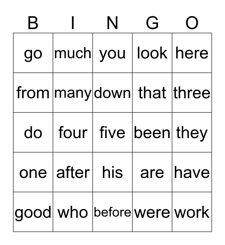 This bingo card has 25 words: after, before, down, good, here, go, from, much, been, his, that, do, are, have, many, work, they, you, three, four, five, who, one, look and were.