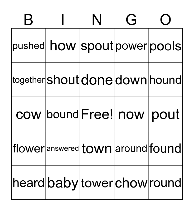 This bingo card has a free space and 24 words: answered, baby, done, heard, pools, pushed, together, how, now, town, down, cow, around, found, shout, chow, pout, spout, hound, bound, round, flower, power and tower.