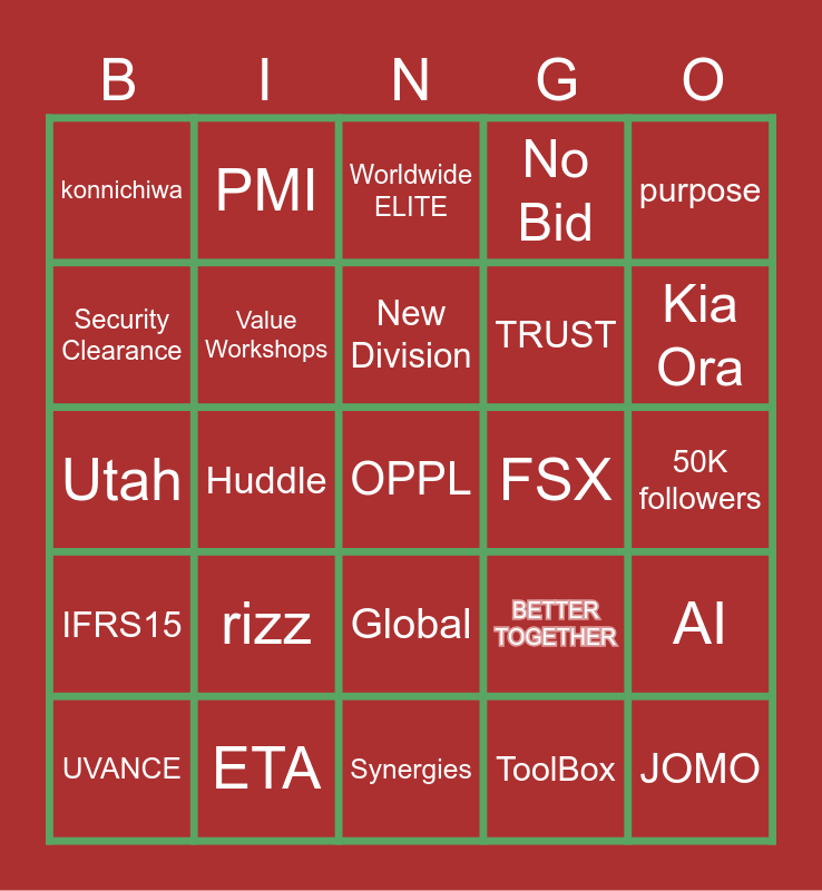 This bingo card has 25 words: rizz, Synergies, New Division, UVANCE, purpose, konnichiwa, Security Clearance, PMI, FSX, Global, TRUST, Utah, BETTER TOGETHER, AI, Value Workshops, JOMO, 50K followers, Worldwide ELITE, Kia Ora, Huddle, OPPL, ETA, IFRS15, No Bid and ToolBox.