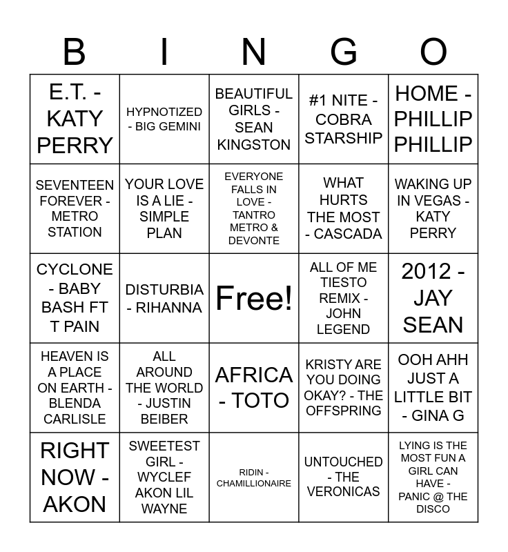 This bingo card has a free space and 40 words: GOOD VIBRATIONS - BEACH BOYS, CYCLONE - BABY BASH FT T PAIN, KNOCK YOU DOWN - KERI HILSON FT KANYE WEST, YOUR LOVE IS A LIE - SIMPLE PLAN, SWEETEST GIRL - WYCLEF AKON LIL WAYNE, AFRICA - TOTO, EVERYONE FALLS IN LOVE - TANTRO METRO & DEVONTE, GONNA MAKE YOU SWEAT - C+C MUSIC FACTORY, HOME - PHILLIP PHILLIP, HEAVEN IS A PLACE ON EARTH - BLENDA CARLISLE, DISTURBIA - RIHANNA, #1 NITE - COBRA STARSHIP, LYING IS THE MOST FUN A GIRL CAN HAVE - PANIC @ THE DISCO, 2012 - JAY SEAN, ALL OF ME TIESTO REMIX - JOHN LEGEND, ALL AROUND THE WORLD - JUSTIN BEIBER, WINDOWS DOWN - BIG TIME RUSH, E.T. - KATY PERRY, THROW YOUR HANDS UP - QWOTE FT PITBULL, BEAUTIFUL GIRLS - SEAN KINGSTON, OOH AHH JUST A LITTLE BIT - GINA G, UNTOUCHED - THE VERONICAS, WHAT HURTS THE MOST - CASCADA, SEVENTEEN FOREVER - METRO STATION, SITTIN AT A BAR - REHAB, SEXY CAN I - RAY J FT YOUNG BERG, SUPER GIRL - SAVING JANE, 7 THINGS - MILEY CYRUS, LET IT ROCK - KEVIN RUDOLF, PIECE OF ME - BRITNEY SPEARS, THATS WHAT YOU GET - PARAMORE, RIGHT NOW - AKON, KISS ME THROUGH THE PHONE - SOULJA BOY FT SAMMIE, KRISTY ARE YOU DOING OKAY? - THE OFFSPRING, WAKING UP IN VEGAS - KATY PERRY, RIDIN - CHAMILLIONAIRE, WHATEVER YOU LIKE - T.I., ROMPE - DADDY YANKEE, HYPNOTIZED - BIG GEMINI and WHATYA WANT FROM ME - ADAM LAMBERT.