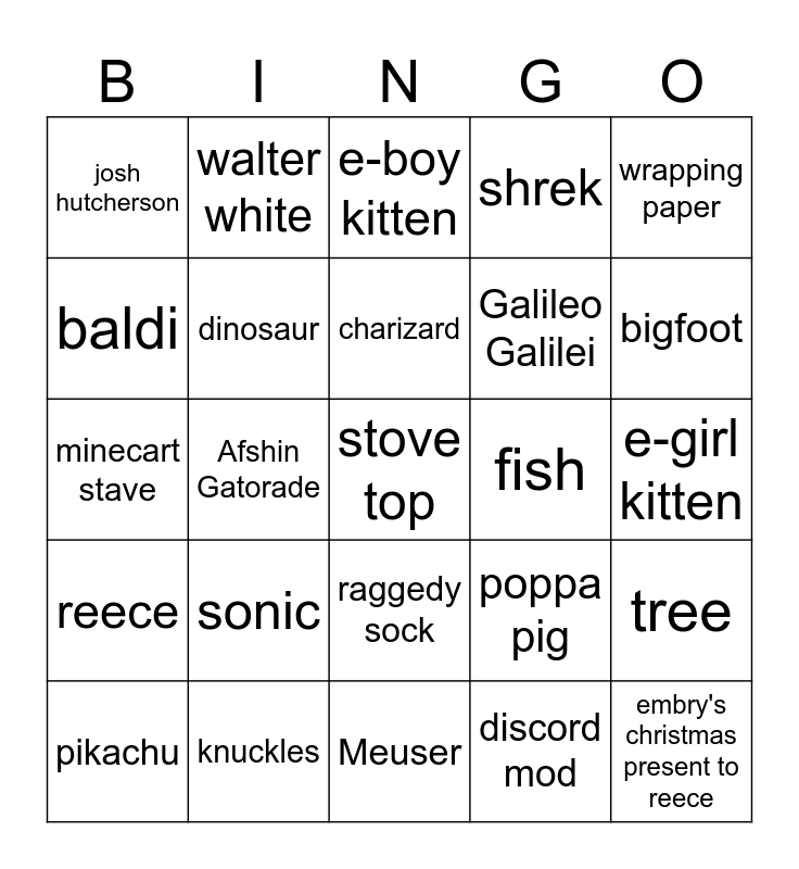 This bingo card has a free space and 24 words: sonic, knuckles, charizard, pikachu, wrapping paper, josh hutcherson, baldi, walter white, fish, raggedy sock, Galileo Galilei, minecart stave, poppa pig, tree, dinosaur, discord mod, e-girl kitten, e-boy kitten, bigfoot, Afshin Gatorade, embry's christmas present to reece, reece, shrek and Meuser.