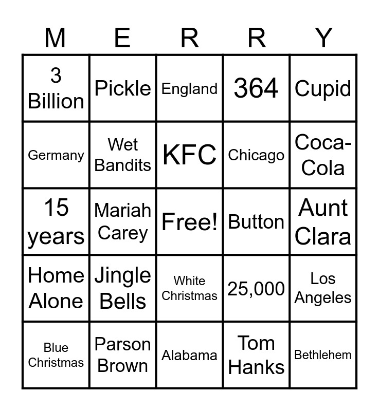 This bingo card has a free space and 43 words: Four, Bethlehem, Macy's, Blue Christmas, Turkey, Tom Hanks, England, Randy, Cupid, Parson Brown, 364, Button, White Christmas, Jingle Bells, Wham!, Alabama, 4,921,200 miles, 15 years, Canada, Coca-Cola, Pickle, New York City, 1611, 3 Billion, Miami, Aunt Clara, Syrup, Max, 25,000, Home Alone, Three, Los Angeles, Little Saint Nick, Mariah Carey, Which famous pop singer has been crowned the Queen of Christmas? Mariah Carey, 13, Eartha Kitt, KFC, Germany, Chicago, Italian, Wet Bandits and Bernard.