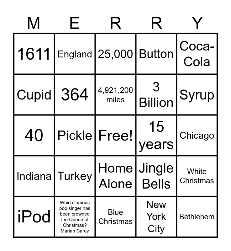 This bingo card has a free space and 50 words: Four, Bethlehem, Macy's, Blue Christmas, Turkey, Tom Hanks, England, Randy, Cupid, Parson Brown, 364, Button, White Christmas, Jingle Bells, Wham!, Alabama, 4,921,200 miles, 15 years, Canada, Coca-Cola, Pickle, New York City, 1611, 3 Billion, Miami, Aunt Clara, Syrup, Max, 25,000, Home Alone, Three, Los Angeles, Little Saint Nick, Mariah Carey, Which famous pop singer has been crowned the Queen of Christmas? Mariah Carey, 13, Eartha Kitt, KFC, Germany, Chicago, Italian, Wet Bandits, Bernard, Librarian, iPod, 40, Eddie Murphy, Seven Years, Indiana and Eight.