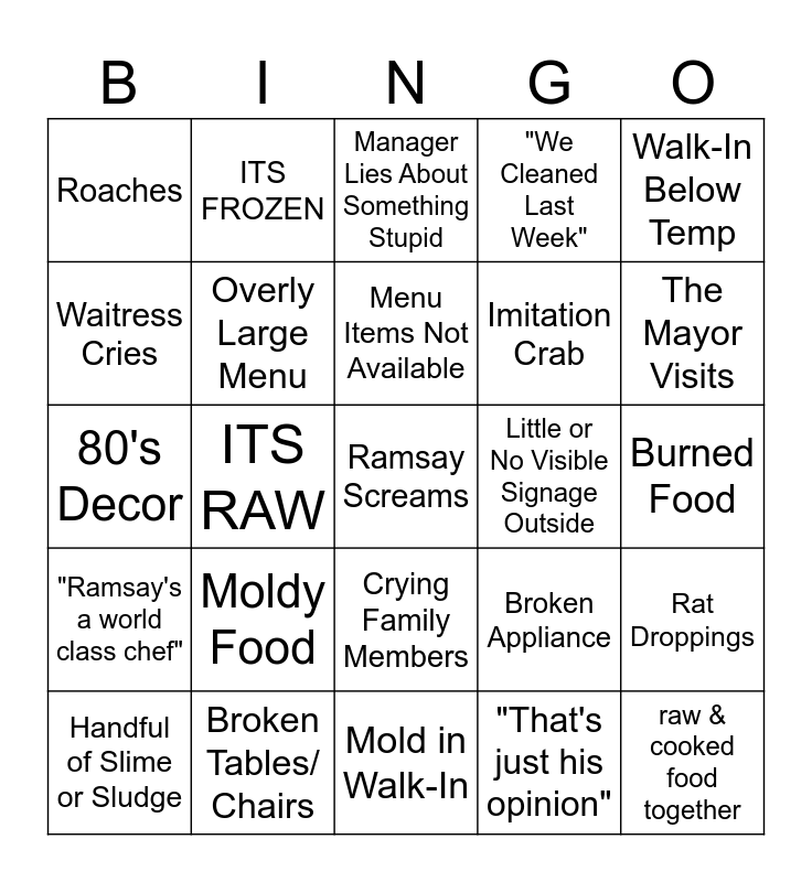 This bingo card has a free space and 24 words: Handful of Slime or Sludge, Moldy Food, Menu Items Not Available, "That's just his opinion", Walk-In Below Temp, Roaches, ITS FROZEN, Manager Lies About Something Stupid, Little or No Visible Signage Outside, Burned Food, 80's Decor, Overly Large Menu, Broken Appliance, Rat Droppings, Waitress Cries, Broken Tables/ Chairs, Mold in Walk-In, "We Cleaned Last Week", The Mayor Visits, "Ramsay's a world class chef", ITS RAW, Crying Family Members, Imitation Crab and raw & cooked food together.