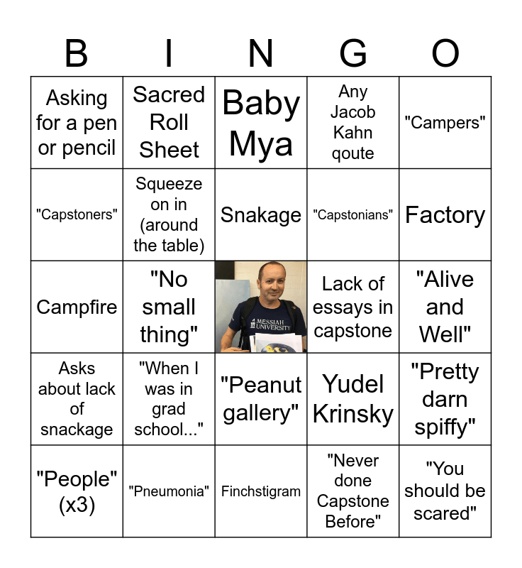 This bingo card has a free space and 24 words: "When I was in grad school...", "Pneumonia", Snakage, "People" (x3), "Campers", Asking for a pen or pencil, "Capstoners", Sacred Roll Sheet, Lack of essays in capstone, "Peanut gallery", "Capstonians", Campfire, Yudel Krinsky, "Pretty darn spiffy", Squeeze on in (around the table), "Never done Capstone Before", "Alive and Well", Baby Mya, Factory, "No small thing", "You should be scared", Asks about lack of snackage, Any Jacob Kahn qoute and Finchstigram.